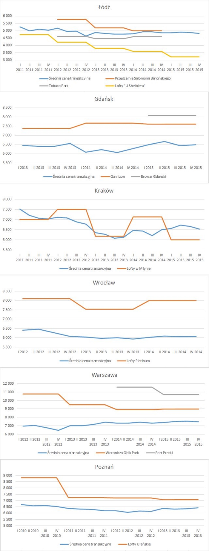 W większości analizowanych miast, w których deweloperzy postawili na adaptacje starych fabryk na budynki mieszkalne, ceny loftów są wyższe od średnich stawek transakcyjnych na rynku pierwotnym – wynika z raportu Cenatorium o cenach loftów i soft loftów w Polsce. Wyjątkiem jest Łódź – w mieście słynącym z opuszczonych budynków przemysłowych, lofty już na start wyceniano niżej, niż wynosiła średnia dla rynku. Wyjątkiem były wprowadzone do sprzedaży w 2012 roku lofty w inwestycji Przędzalnia Salomona Barcińskiego – stawka za 1 mkw. była o 600 zł wyższa od średniej ceny transakcyjnej. Z czasem jednak spadała i niemal zrównała się ze średnią ceną lokali mieszkalnych w Łodzi. Godzi to raczej w prestiż i ekskluzywność takich projektów, bo przy takich cenach, lofty kwalifikują się do dopłat w programie „Mieszkanie dla młodych”, który miał zaspokoić podstawowe potrzeby mieszkaniowe.