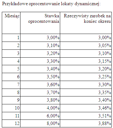 W reklamach lokat dynamicznych banki eksponują stawkę z ostatniego miesiąca. Jesteśmy kuszeni sloganami typu „Zarób do 8 proc. na lokacie”. I jest to prawda, z tym, że wysoki zysk dotyczy tylko ostatniego miesiąca. Z reguły średnie oprocentowanie lokat dynamicznych jest porównywalne do zwykłych lokat terminowych. Aby je policzyć, należy zsumować stawki z każdego miesiąca, a następnie wynik podzielić przez liczbę miesięcy. Dla podanego wyżej przykładu średnie oprocentowanie wyniesie 3,88 proc. Oczywiście pod warunkiem, że lokata zostanie utrzymana przez cały okres umowy.