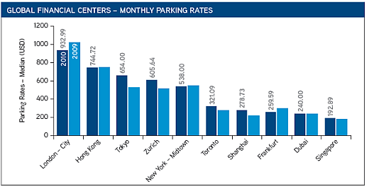 Liderem wśród najdroższych miast do parkowania w ujęciu miesięcznym jest Londyn. Wyróżniono londyńskie City oraz dzielnicę West End, które znalazły się odpowiednio na miejscu 1 i 2 na świecie. Miesięczne stawki parkingowe w londyńskim City na poziomie 933.00 USD (643.00 GPB) górowały na światowej liście, zaraz za nim uplasowała się dzielnica West End z 874.00 USD (602.00 GBP). W aktualnych stawkach parkingowych odbija się również fakt, że liczne centra finansowe znowu rosną w siłę. Stawki parkingowe w londyńskim City wzrosły o 2.1% w ciągu ostatnich 12 miesięcy, tymczasem stawki w dzielnicy West End wzrosły o 2.0% (w lokalnej walucie) w stosunku do poziomu z roku 2009. W pierwszej trójce znalazł się również Hong Kong z miesięczną stawką na poziomie 745.00 USD (5,800.00 HKD). Co ciekawe, w pierwszej dziesiątce rankingu znowu znalazły się australijskie miasta: Sydney na miejscu 7 oraz Perth na 8 (Brisbane znalazło się całkiem blisko pierwszej dziesiątki, na miejscu 15).