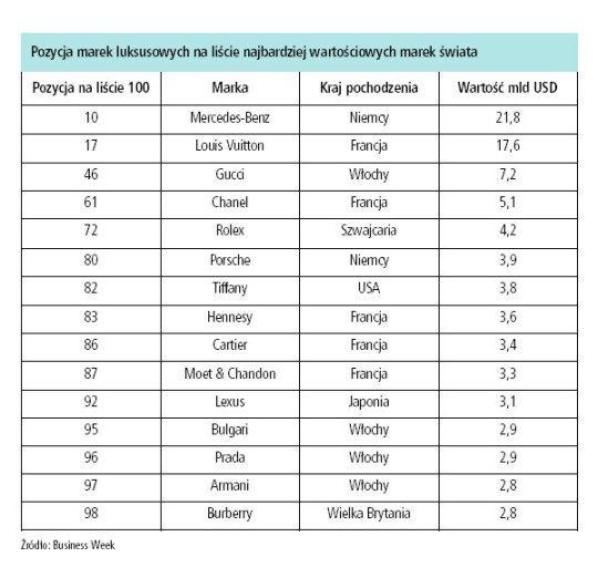 Relatywnie niewielki zasięg marek luksusowych ma bezpośredni wpływ na ich wartość rynkową. Na liście 100 najbardziej wartościowych marek świata według rankingu Interbrand w roku 2006 znalazło się tylko 15 marek produktów luksusowych.