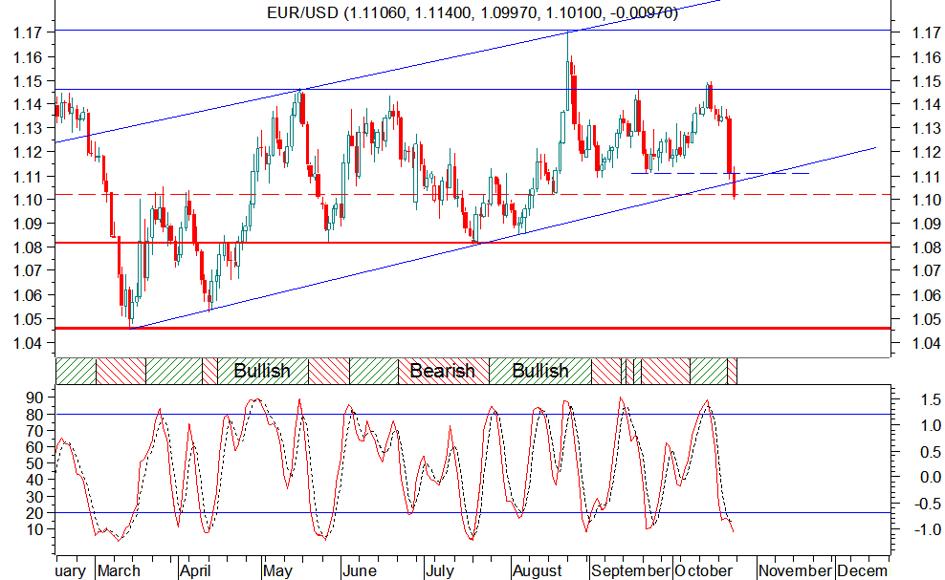 Dopóki kurs EUR/PLN poruszać się będzie w górę pomiędzy ramionami klina, nie przebijając go, nie będzie sygnału do gry na spadek kursu EUR/PLN. Ale gdy tylko dolne ramie klina zostałoby przełamane, od razu pojawi się cała rzesza "techników", którzy zaryzykują i zagrają w zdecydowany sposób na umocnienie złotego. Sądzę, a nawet jestem tego mocno pewny, że w drugiej połowie listopada i w grudniu kurs EUR/PLN będzie znacznie niżej niż jest dziś. Statystycznie rzecz biorąc - na podstawie statystyk z ostatnich 20 lat rynku EUR/PLN - grudniowy dołek powinien być oddalony od szczytu o nie mniej niż 15 groszy i nie więcej niż 25 groszy.