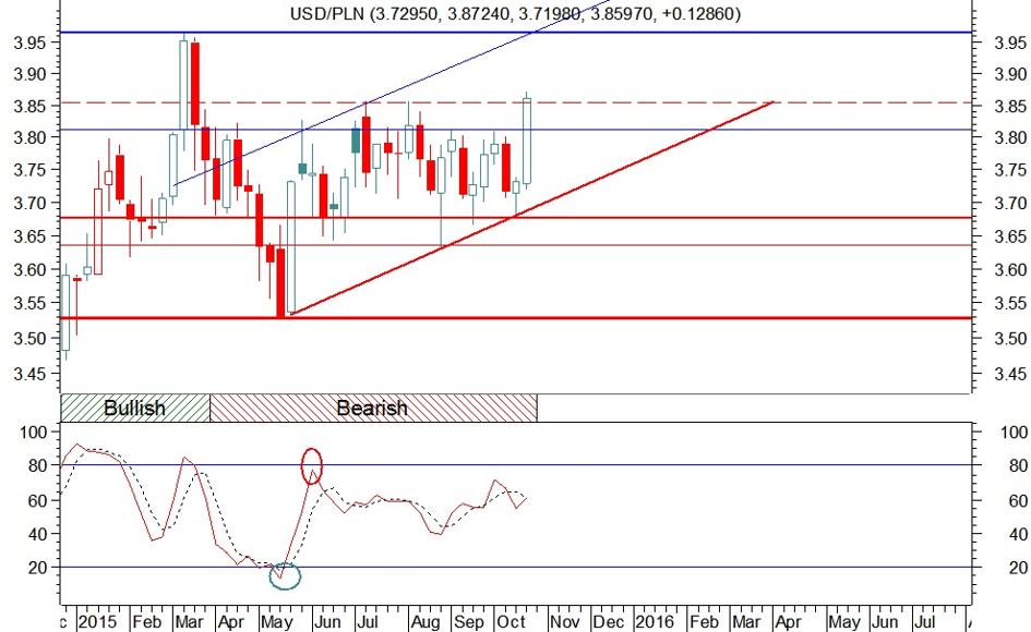 Na wykresie widać kanał rosnący, w jakim porusza się kurs USD/PLN od połowy maja 2015 roku. Taki układ linii wskazuje na większe prawdopodobieństwo kontynuacji trendu rosnącego, niż jego zakończenie. Istotne jest to, że rynek zdołał przebić się powyżej poziomu 3,86 - będącego szczytami z lipca oraz sierpnia bieżącego roku. Z punktu widzenia analizy technicznej otwiera to drogę do ataku na szczyt ustanowiony 13 marca na wysokości 3,9670.