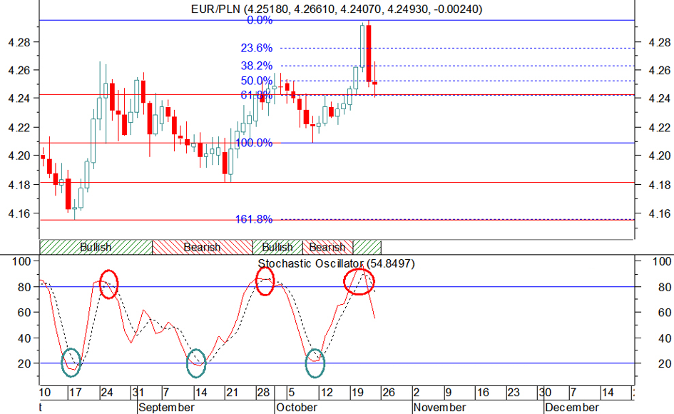 Na wykresie EUR/PLN widać dwie fale rosnące - pierwsza z poziomu 3,97 do 4,24 - jaka zrealizowała się od kwietnia do lipca oraz druga z poziomu 4,09 zapoczątkowana we wrześniu i trwająca do dziś. Jeśli te dwie fale będą miały taki sam zasięg 27 groszy, to szczyt tej obecnej fali rosnącej powinien dotrzeć w okolice 4,36. Z tego wynika moja prognoza, że przed 15 listopada zdążymy jeszcze osiągnąć tez poziom 4,36. Przy czym aby była jasność. Nie zachęcam do gry na wzrost kursu EUR/PLN. Ciekawsza, dająca więcej szans powodzenia jest gra na umocnienie złotego, czyli na spadek kursu EUR/PLN. Wspomniany przeze mnie poziom 4,36 należałoby więc potraktować jako dobre miejsce do rozpoczęcia takiej gry na umocnienie złotego. Jeśli rynek nie spanikuje tak bardzo jak się tego spodziewam - czyli jeśli nie dotrzemy w okolice 4,36, to grę na umocnienie złotego można rozpocząć nieco niżej. Może nawet warto rozpocząć taką inwestycję na raty rozpoczynając pierwszą porcję już przy obecnych poziomach z okolic 4,29.