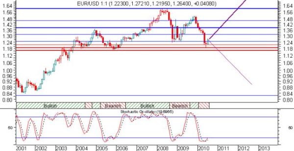 Zacznijmy tradycyjnie od najważniejszej pary walutowej jaką jest EUR/USD. Na wykresie świec miesięcznych możemy dostrzec, iż wsparcie z przedziału 1,16-1,18 (ważny dołek z końca 2005 roku oraz obecny dołek z czerwca 2010) powinien przez jakiś czas powstrzymywać deprecjację EURO i umacnianie się Dolara względem waluty europejskiej.