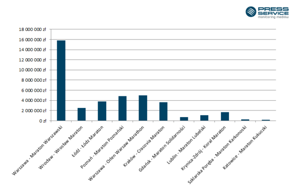 Z analizy ekwiwalentu reklamowego miast w kontekście biegowych imprez sportowych wynika, że AVE komunikatów na temat Warszawy wyniosło ponad 21 mln zł- 15,9 mln zł to wynik dla informacji traktujących o Maratonie Warszawskim, a 5 mln zł - o Orlen Warsaw Marathon. Kolejne miejsca w klasyfikacji zajęły Poznań - doniesienia medialne na temat tej miejscowości były warte 4,9 mln zł, Łódź - 3,8 mln zł oraz Kraków - 3,7 mln zł.