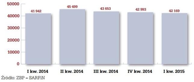 Wykres. Liczba nowo podpisanych umów o kredyt kwartalnie w okresie I kw. 2014 r. - I kw. 2015 r.