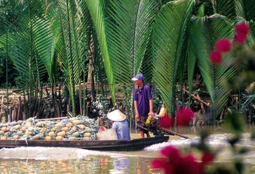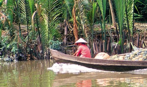 Z pewnością równie sławna jak sam Mekong jest delta Mekongu z polami ryżowymi. Obecność pól ryżowych w delcie wiąże się z wielkim, pełnym ryb, leżącym w Kambodży jeziorem Tonle Sap. Mekong jest z nim połączony kanałem. W lecie na skutek deszczów monsunowych poziom wody w rzece jest wyższy niż wody w jeziorze. Jezioro napełnia się wodą i zwiększa swą powierzchnię do ponad 10 000 km2, stając się trzy razy większe niż w porze suchej. Pod koniec pory deszczowej wody jeziora przelewają się do delty. Niegdyś delta była pełna bagien, w których żyło wiele krokodyli. Obecnie tworzy sieć niezliczonych kanałów z przerzuconymi nad nimi, bambusowymi małpimi mostkami. Kanałami przemieszczają się niezliczone sampany zmierzające każdego ranka w stronę pływających targów. Barki są wypełnione różnorodnymi towarami: drobiem, zwierzętami hodowlanymi, warzywami, smacznymi owocami. W delcie jest mnóstwo ogrodów, sadów, pól uprawnych. Ale najważniejsze są założone tam plantacje ryżu.