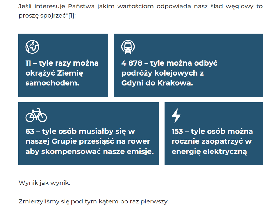 Jesteśmy jednak ambitni i chętnie przeskoczymy poprzeczkę – jeżeli potrzeby Klientów będą wymagały śladu węglowego na poziomie 15 okrążeń Ziemi, to nie będzie to dla nas problem.