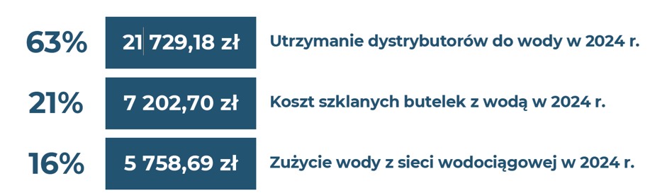 „Oprócz wody z sieci wodociągowej używamy także dystrybutorów do wody. Naszym klientom (i Zarządowi) zapewniamy wodę w szklanych butelkach. Plastik jest naszym zdaniem nieestetyczny i nieelegancki. Na wodę butelkowaną moglibyśmy wydać mniej, ale niektórzy pracownicy podbierają nam te butelki, kiedy nikt nie patrzy.”