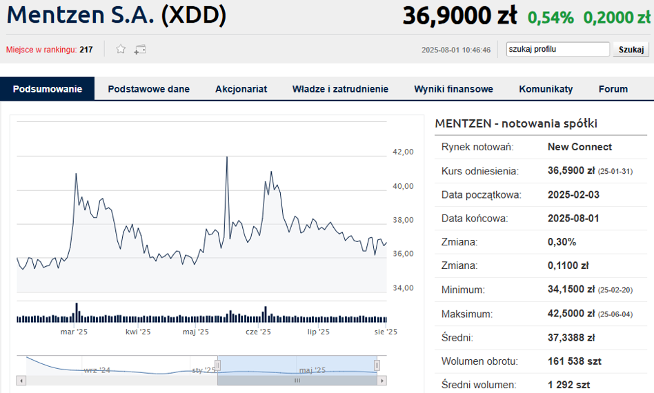Prezentacja wyników za II kwartał nie wpłynęła w widoczny sposób na notowania spółki. Akcje Mentzen S.A. zyskiwały w piątek przedpołudniem 0,52% przy obrotach o wartości 6176 zł.