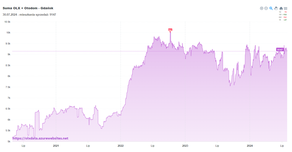 Odmienna sytuacja panuje w Gdańsku, gdzie pod koniec lipca dostępnych było 9147 ofert sprzedaży mieszkań – niemal dokładnie tyle, ile przed rokiem (+0,3 proc. r/r) i jednocześnie o blisko 9 proc. (nominalnie o 900 mieszkań) mniej niż w październiku 2022 r., gdy gdańska oferta była najobfitsza.