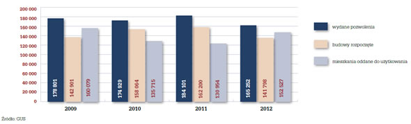Spadki widoczne są również w liczbie wydanych pozwoleń na budowę. W porównaniu z czwartym kwartałem 2011 roku było ich mniej o 13%. Znaczący wzrost odnotowano jednak w liczbie mieszkań oddanych do użytkowania. Na rynek trafiło niemal 50 tysięcy nowych lokali, a w całym 2012 r. liczba ta sięgnęła 152 tysięcy. To najlepszy wynik od 2009 roku.