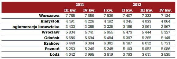 Rok 2012 zakończył się kolejnym spadkiem średnich cen mieszkań. Ceny transakcyjne spadały niemal we wszystkich największych miastach w Polsce. Wyjątek stanowiły Białystok i Poznań, gdzie różnice w porównaniu z poprzednim kwartałem były minimalne.