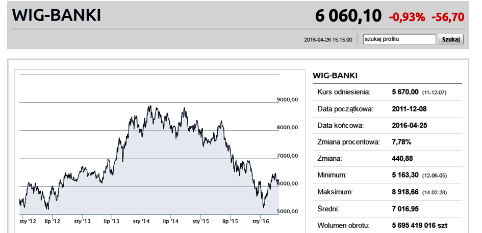 W notowania banków w 2015 roku uderzało widmo przewalutowania kredytów frankowych, a także zapowiedź wprowadzenia podatku bankowego. Spółki z sektora musiały także składać się na upadające SKOK-i i banki spółdzielcze, a wymogi KNF dotyczące bezpieczeństwa sprawiły, że część banków zawiesiła dywidendy. WIG-Banki lokalne maksima wyznaczył w maju 2015 roku, w styczniu 2016 roku był notowany niemal 30 proc. niżej.