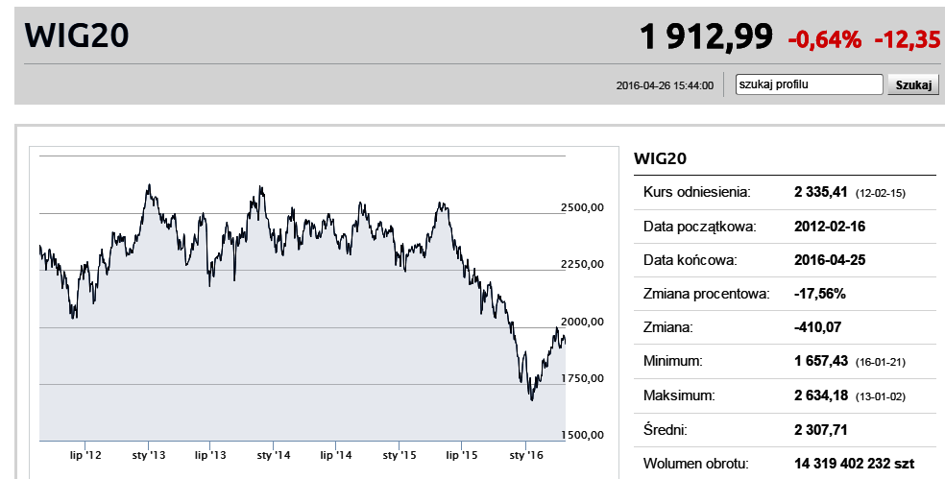 Dokładnie rok temu WIG20 wspiął się na poziom 2558,58 punktów. Dla indeksu blue chipów był to najwyższy poziom od września 2014 roku, do poprawienia ówczesnych maksimów zabrakło niecałe półtora punktu. W kolejnych dniach wyniku tego nie udało się jednak poprawić, a w połowie maja WIG20 rozpoczął powolne opadanie w stronę poziomu 2000 punktów. Granica ta została przebita w listopadzie, a w połowie stycznia wartość indeksu wynosiła przez moment ledwie 1657,43 punktów. W ciągu niecałego roku WIG20 stracił więc ponad 35%.
