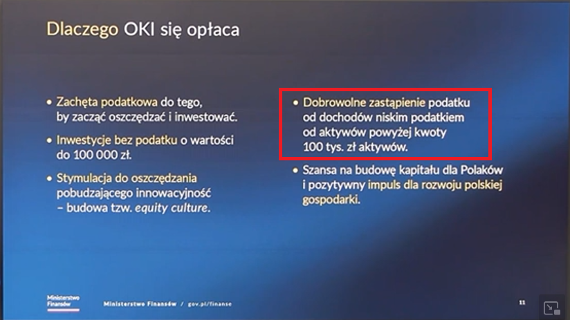 Domański wskazał, że na OKI nieopodatkowane do 100 tys. zł będą tylko nowe środki, tzn. jeżeli ktoś chciałby nie płacić podatku od zysków kapitałowych musiałby sprzedać posiadane aktywa i wpłacić je na OKI. części oszczędnościowej OKI można będzie otwierać lokaty i składać zapisy na obligacje oszczędnościowe (do 25 tys. zł wartości oszczędności bez podatku).