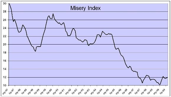 Te potoczne opinie znajdują potwierdzenie w sporządzanym przez Bankier.pl Misery Index, który we wrześniu obniżył się z 11,8 do 11,6. Jeśli wierzyć szacunkom ekonomistów, to w październiku zaobserwujemy dalszą poprawę warunków życia i spadek Misery Index do poziomu 11,5. O ile jeszcze zimą i wiosną głównym zmartwieniem Polaków były rosnące ceny (inflacja CPI na poziomie 4%), to jesienią znów wracają obawy związane z rynkiem pracy. Ponieważ bezrobocie jest wskaźnikiem podążającym ze sporym opóźnieniem względem koniunktury gospodarczej, to problemy ze znalezieniem zatrudnienia zapewne będą widoczne przynajmniej do końca 2010 roku. Niemniej jednak według statystyk Eurostatu polski rynek pracy trzyma się zaskakująco dobrze. We wrześniu bez pracy pozostawało 8,2% siły roboczej, czyli nieznacznie więcej niż w maju, ale też o 1,7 pkt. proc. więcej niż rok temu, gdy bezrobocie w Polsce odnotowało wieloletnie minimum. Mimo to polski wskaźnik Misery Index jest obciążony właśnie przez stopę bezrobocia, która odpowiada za 70% jego wartości.