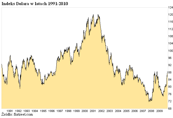 Od grudnia dolar zyskuje na wartości względem większości najważniejszych walut świata. Euro straciło ponad 20%, funt osłabł o 13,5%, a dolar australijski o 14%. Względem japońskiego jena amerykańska waluta zyskała 7,6%, ale wobec dolara kanadyjskiego straciła 3,4%. „Zielony” zyskał za to 15,5% w stosunku do szwajcarskiego franka oraz 27% względem polskiego złotego (według notowań z 10. czerwca. Wszystkie zmiany liczone względem lokalnych minimów/maksimów z listopada i grudnia 2009).