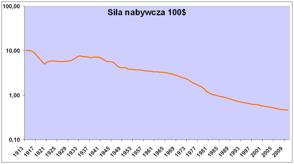 Liczy się bowiem ilość towarów i usług, jakie możemy nabyć za jednostkę pieniądza. W roku 1913 sto dolarów amerykańskich kupowało 10-krotnie większy koszyk dóbr niż na początku lat 80. Ekspansja monetarna finansująca I Wojnę Światową zmniejszyła siłę nabywczą amerykańskiego pieniądza o 42% w ciągu zaledwie czterech lat. Od roku 1940 wartość dolara systematycznie malała. W roku 2000 studolarowy banknot kupował już tylko 5,7% tego, co 87 lat wcześniej. Obecnie studolarówka jest warta ledwie 4,6% tego, co przed rokiem 1914 oraz o 20% mniej niż dekadę temu.