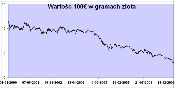 Ten sam proces, zwany przez ekonomistów inflacją, dręczy także wszystkie pozostałe waluty świata. Na początku tysiąclecia stueurowy banknot stanowił równowartość przeszło 11 gram złota. Przez następne pięć lat euro reprezentowało stabilną siłę nabywczą równą mniej więcej 9-10 gramom złota. Proces deprecjacji wspólnotowej waluty nieprzypadkowo zbiegł się w czasie ze znaczącym wzrostem podaży europejskiego pieniądza. Dziś za sto euro można nabyć jedynie 3,1 gram złota, czyli o 72% mniej niż na początku stulecia. Ostatnie decyzje Europejskiego Banku Centralnego sprawią, że euro będzie tracić swą siłę nabywczą w równie szybkim tempie co amerykański dolar. Dywagacje na temat tego, która waluta będzie tracić szybciej, dla większości zwykłych inwestorów nie mają większego znaczenia.
