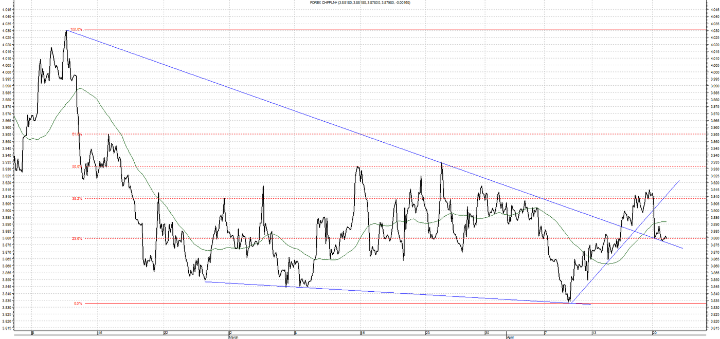 Kurs CHF/PLN porusza się Od ponad dwóch miesięcy w trendzie bocznym pomiędzy poziomami 3,8400 a 3,9300. W przypadku ruchu w górę opór stanowiło będzie bardzo niechętnie widziane przez kredytobiorców frankowych maksimum lokalne na wspomnianym 3,9300. Dla ruchu w dół wsparciem jest poziom 3,8750 czyli Czyli przebita poprzednia linia oporu.