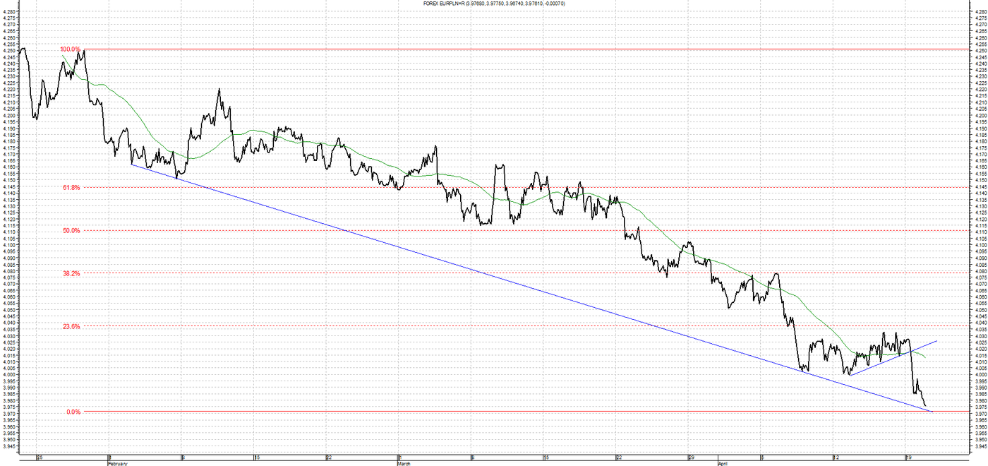 Kurs EUR/PLN po odbiciu się od linii oporu gwałtownie spada. Przebite zostało dwuletnie minimum na 4,0350, a kurs dalej próbuje ustanowić niższe poziomy przebijając symboliczne nawet 4,0000. Oporem dla wzrostów będzie linia łącząca maksima ostatnich tygodni na poziomie 4,05000. Wsparciem jest poziom 3,9700 czyli przedłużenie linii łączącej minima lokalne.