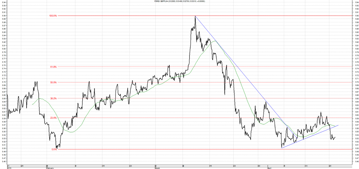 Na wykresie zaobserwowaliśmy wybicie dołem z kanału wzrostowego. Po zejściu do poziomu 5,5000 kurs zawrócił, jednakże korekta jest na razie bardzo słaba. Wsparciem będzie wspomniane minimum.