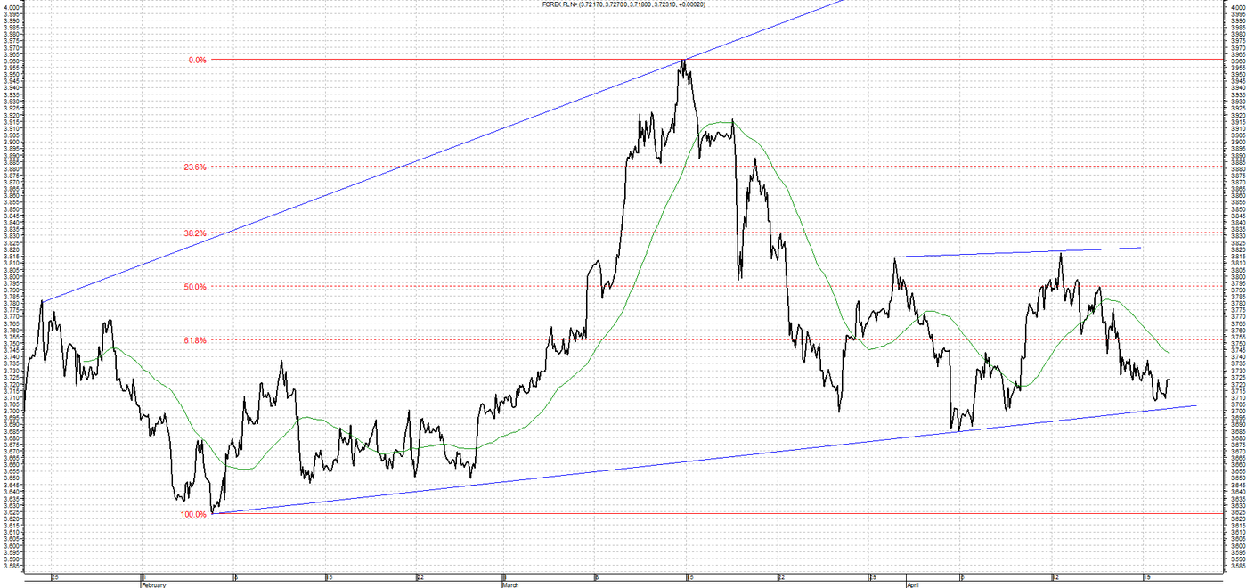 Kurs USD/PLN od początku roku porusza się w trendzie bocznym z jednym bardzo wyraźnym ruchem w górę, który po chwili został skorygowany. Wsparciem są okolice 3,7000, gdzie przebiega linia łącząca minima lokalne. Oporem jest ostatnie maksimum lokalne na 3,9600.