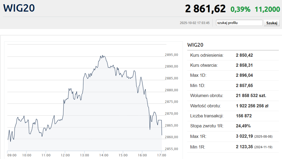 Podczas sesji 2 października na europejskich giełdach i polskim parkiecie dominował zielony kolor. W momencie, gdy w Warszawie kończył się handel niemiecki DAX zyskiwał 1,16%, a francuski CAC40 notował zwyżkę o 1,09%. Amerykańskie S&P500 i Nasdaq znajdowały się natomiast w pobliżu punktów odniesienia.