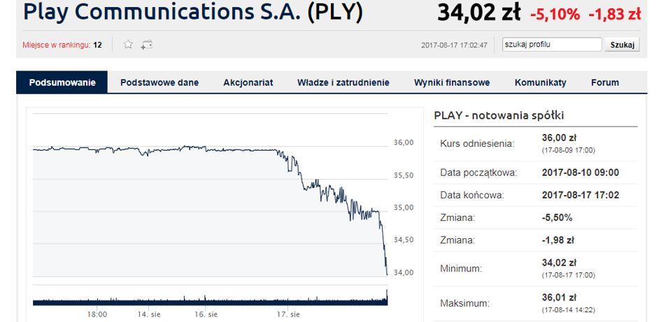 Problem w tym, że po 10 sierpnia z puli tej zostało ledwie 2,45 mln akcji. Wprawdzie łączny wolumen z piątku, poniedziałku i środy (11, 14 i 16 sierpnia) nie przekroczył 2,45 mln akcji (wyniósł 2,05 mln sztuk), więc limitu wczoraj jeszcze nie wyczerpano (dodatkowo ciężko zakładać, że Morgan brał udział w każdej transakcji), dzisiaj jednak właściciela zmieniło aż 1,8 mln sztuk akcji, co już z punktu widzenia stabilizatora z tak niewielkim limitem wydaje się poważnym problemem. Odpowiedź na pytanie, czy w magazynku Morgana została jeszcze jakaś amunicja, poznamy najprawdopodobniej jutro w raporcie ESPI. Z fundamentalnego punktu widzenia należy także odnotować, że UKE przyznał Play częstotliwości w zakresach 3701-3715 MHz oraz 3715-3729 MHz.