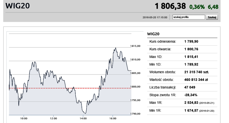 | WIG 20 | Polska | 1806,38 | 0,36 | -0,50 | -7,97 | -28,35 | -2,84 |