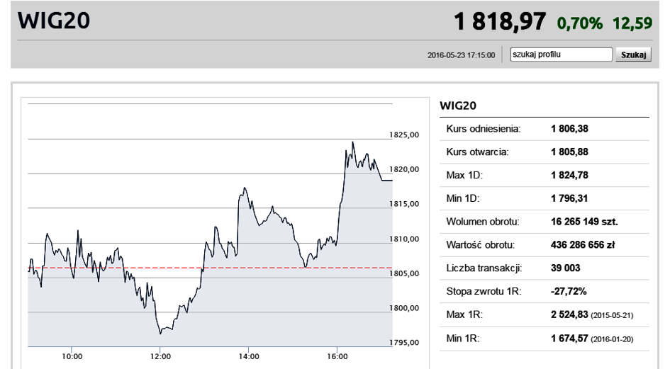 | WIG 20 | Polska | 1818,97 | 0,70 | -1,88 | -6,38 | -27,73 | -2,16 |