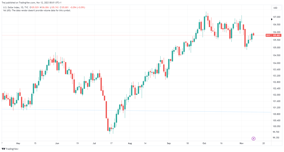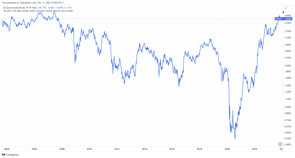 Rentowności amerykańskich obligacji rosną, z przerwami, od covidowego dołka w marcu 2020 r., osiągając poziomy w okolicach 5 proc., najwyższe od 2007 r. Jest to powiązane z podwyżkami stóp procentowych, jakie aplikuje Fed amerykańskiej gospodarce w celu obniżenia inflacji do założonego celu. Próbując ograniczyć inflację, Rezerwa Federalna podniosła stopy procentowe z poziomu bliskiego zera w marcu 2022 r. do przedziału 5,25–5,5 proc. Ostatnio Fed zaaplikował rynkowi przerwę w podwyżkach stóp.