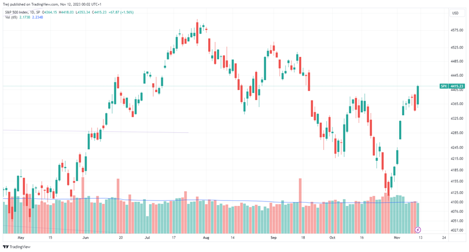 Sierpniowa decyzja agencji Fitch o obniżeniu ratingu zbiegła się z rynkowym szczytem na indeksach w USA. Przez kolejne trzy miesiące amerykańskie indeksy zniżkowały, osiągają pod koniec października przynajmniej lokalny dołek. Ostatnie dwa tygodnie to z kolei gwałtowne odbicie, które podniosło notowania indeksu S&P500 o blisko 8 proc., a indeksu Nasdaq100 o niemal 10,5 proc. W efekcie ten drugi indeks jest już tylko o 2,5 proc. od swojego rekordu wszech czasów. Indeks S&P500 dzieli od rekordu ponad 4 proc.