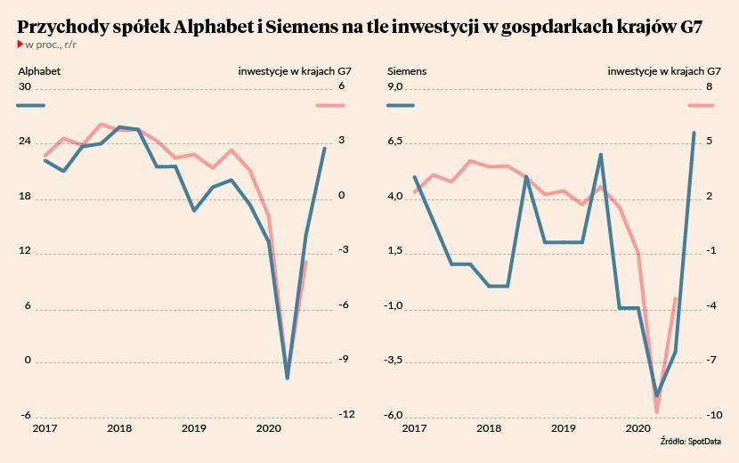 Przychody firmy Alphabet, czyli właściciela Google’a, wzrosły w minionym kwartale o 24,5 proc. rok do roku, najszybciej od 10 kwartałów, na fali ożywienia popytu na reklamę cyfrową. Te dane są o tyle ciekawe, że wydatki reklamowe są papierkiem lakmusowym wydatków rozwojowych firm. Wprawdzie nie należą do kategorii inwestycji (są kosztem bieżącym firm), ale w długim okresie nakłady na reklamę i inwestycje są mocno skorelowane. W końcu firmy reklamują się wtedy, gdy chcą się rozwijać i czują popyt – wtedy też inwestują.