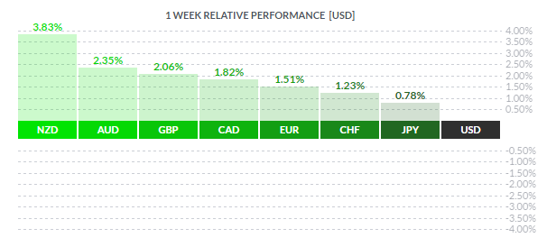 Dolar nowozelandzki jest najmocniejszą walutą tygodnia, zyskuje 3,83% względem dolara amerykańskiego.