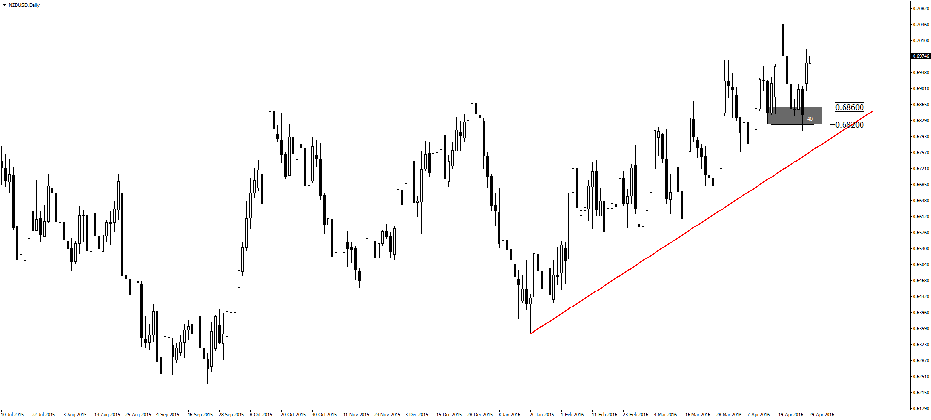 Na przestrzeni ostatnich kilku tygodni dolar nowozelandzki umacniał się w stosunku do dolara amerykańskiego. Ostatnie posiedzenie FED-u oraz RBNZ nie zmieniło sentymentu ani do USD, ani do NZD. FED pozostawił stopy procentowe na niezmienionym poziomie, po decyzji został opublikowany również komunikat banku centralnego, który nie wniósł nic nowego. Również i Bank Centralny Nowej Zelandii nie zdecydował się na zmianę stóp procentowych. Dlatego też kontynuacja trendu jest jak najbardziej prawdopodobna.