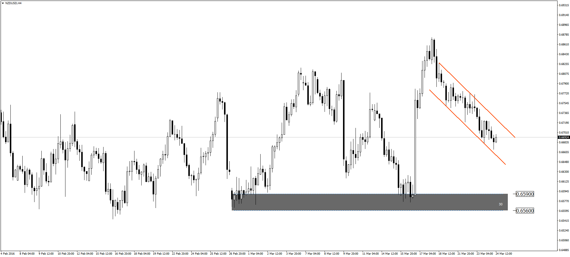 Pomimo dobrych danych makroekonomicznych dolar nowozelandzki w dalszym ciągu znajduje się pod presją sprzedających. Na interwale czterogodzinnym waluta nowozelandzka poruszą się w kanale spadkowym, aktualnym celem sprzedających może być strefa popytu 0,656-0,659. Dzisiejszego dnia o godzinie 13:30 poznamy dane makroekonomiczne ze Stanów Zjednoczonych, które mogą wpłynąć na sytuacje na wykresie.
