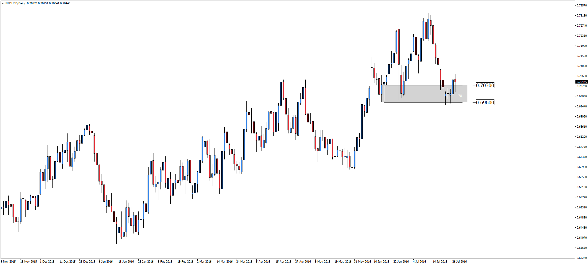 Najbliższe posiedzenie Centralnego Banku Nowej Zelandii odbędzie się 11 sierpnia. Aktualnie rynek z 88% prawdopodobieństwem wycenia obniżkę stóp procentowych. Jest to powód, dla którego dolar nowozelandzki był od pewnego czasu panicznie wyprzedawany. Gdyby bank nie zdecydował się na obcięcie stóp procentowych, to moglibyśmy zauważyć spore umocnienie waluty nowozelandzkiej, jednakże ostatnie reformy oraz zaostrzenia wprowadzone przez BC na rynku nieruchomości sprawiają, że obniżka stała się o wiele bardziej prawdopodobna.