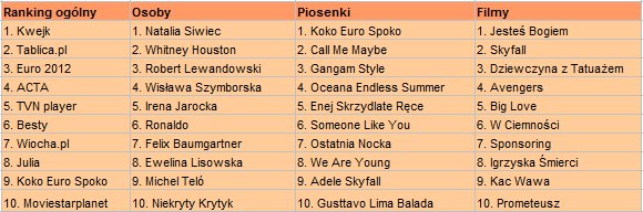 Najczęściej poszukiwanym w Google polskim zwrotem był "kwejk". Tuż za popularnym serwisem rozrywkowym uplasowała się fraza "Tablica.pl". Dopiero ostatnie miejsce na podium przypadło "euro 2012". Burzliwa dyskusja na początku roku na temat ACTA spowodowała, że skrót tej międzynarodowej umowy trafił tuż za pierwszą trójkę zestawienia. Warto zaznaczyć, że w pierwszej dziesiątce zestawienia znalazła się także towarzysząca rozgrywkom Euro 2012 piosenka "Koko Euro Spoko".