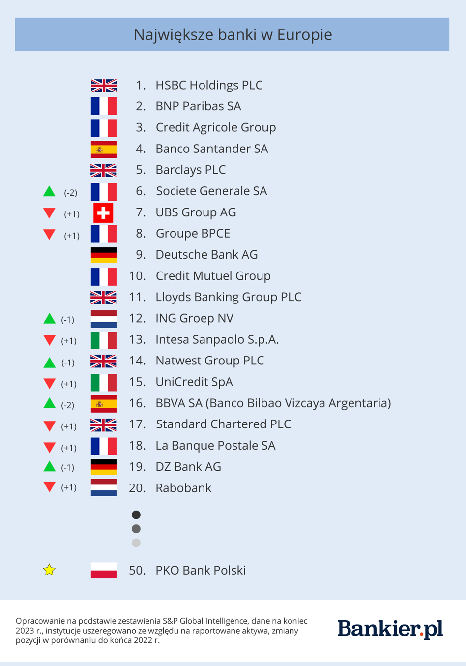 W 2024 r. po raz pierwszy na liście największych instytucji bankowych w Europie znalazł się PKO Bank Polski. PKO mógł pochwalić się na koniec 2023 r. aktywami wartymi 115 mld euro i jest on jedynym kredytodawcą z Europy Środkowo-Wschodniej obecnym w zestawieniu.
