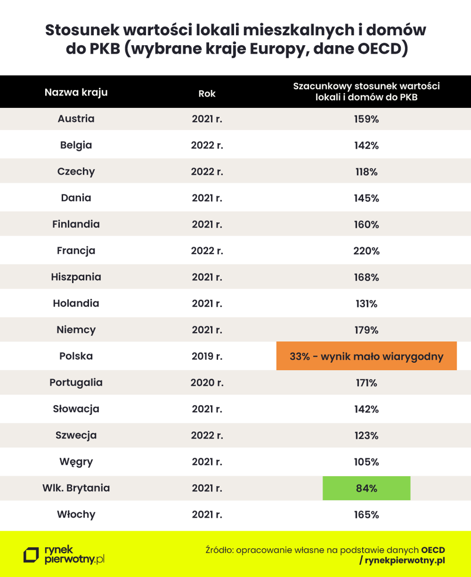 Mianowicie - OECD podaje bardzo niską wycenę zasobu mieszkaniowego Polski na poziomie około 750 mld zł w 2019 roku. Efektem jest relacja wartości lokali i domów do PKB wynoszącą zaledwie 33% (2019 r.). Właśnie dlatego wynik dla Polski bazujący na danych OECD można uznać za mało wiarygodny. Tym bardziej że nieco późniejsze dane z innych krajów Europy sugerują wartość majątku mieszkaniowego jako 100-200% PKB.