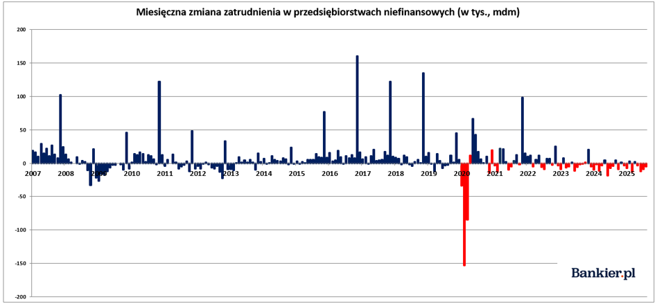 Pomijając styczniowe „wyskoki” statystyk zatrudnienia (wynikające z corocznej zmiany próby badanych przedsiębiorstw), zatrudnienie w sektorze przedsiębiorstw maleje niemal nieprzerwanie od początku 2023 roku. Od początku 2025 roku ubyło w sumie 49,5 tys. etatów.