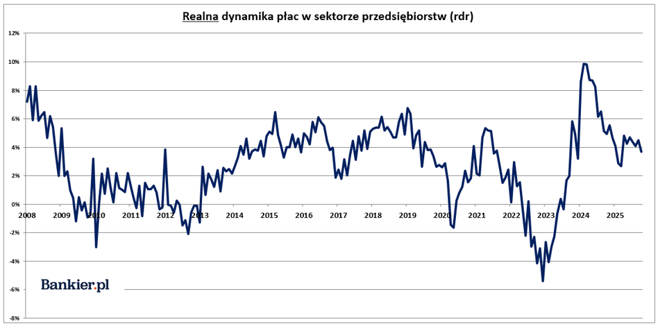 We wrześniu wynik wyniósł 7,5 proc. i po sierpniu był do tej pory drugim najniższym w tym roku. Statystycy policzyli, że w październiku "średnia krajowa" była 1,3 proc. wyższa niż miesiąc wcześniej. Z kolei wzrost płac w ujęciu realnym po uwzględnieniu inflacji CPI za październik 2025 roku wyniósł tylko 3,70 proc. rok do roku i był najniższy od marca. We wrześniu było to 4,47 proc. rdr, a w sierpniu 4,08 proc.