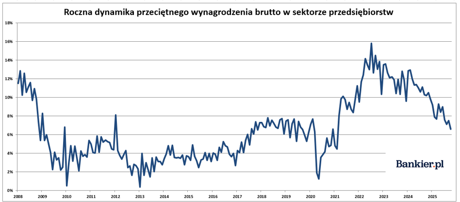 Przeciętne wynagrodzenie w dużych przedsiębiorstwach niefinansowych w październiku 2025 roku wyniosło 8750,34 złotych brutto i było o 6,6 proc. wyższe niż przed rokiem. To najniższa roczna dynamika wzrostu średnich pensji od lutego 2021 r. Prognozy ekonomistów zakładały wzrost o co najmniej 7,3 proc.