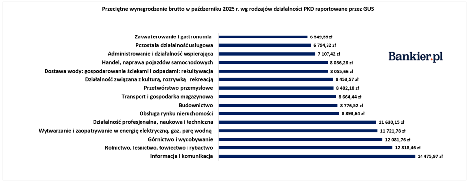 Przy okazji raportu o średnich płacach GUS publikuje także przeciętne miesięczne wynagrodzenie brutto wg rodzajów działalności PKD. Zgodnie z tą systematyką w październiku najwięcej zarobili pracownicy działu „Informacja i komunikacja” (14 475,97zł brutto). Sekcja ta obejmuje produkcję i rozpowszechnianie informacji i dóbr kultury, ale także działalność usługową w zakresie technologii informatycznych, przetwarzanie danych oraz pozostałą działalność usługową w zakresie informacji.