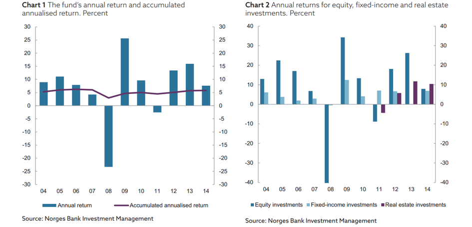 Rok 2014 norweski megafundusz zakończył ze stopą zwrotu sięgającą 7,6%. To wynik zdecydowanie gorszy niż rok wcześniej - wówczas fundusz zyskał 15,95% - jednak w ujęciu historycznym na pewno satysfakcjonujący. W okresie od początku 1998 roku do końca 2014 roku fundusz osiągnął roczną stope zwrotu na poziomie 5,8%. Po odjęciu kosztów zarządzania i inflacji stopa ta topnieje do 3,8%.