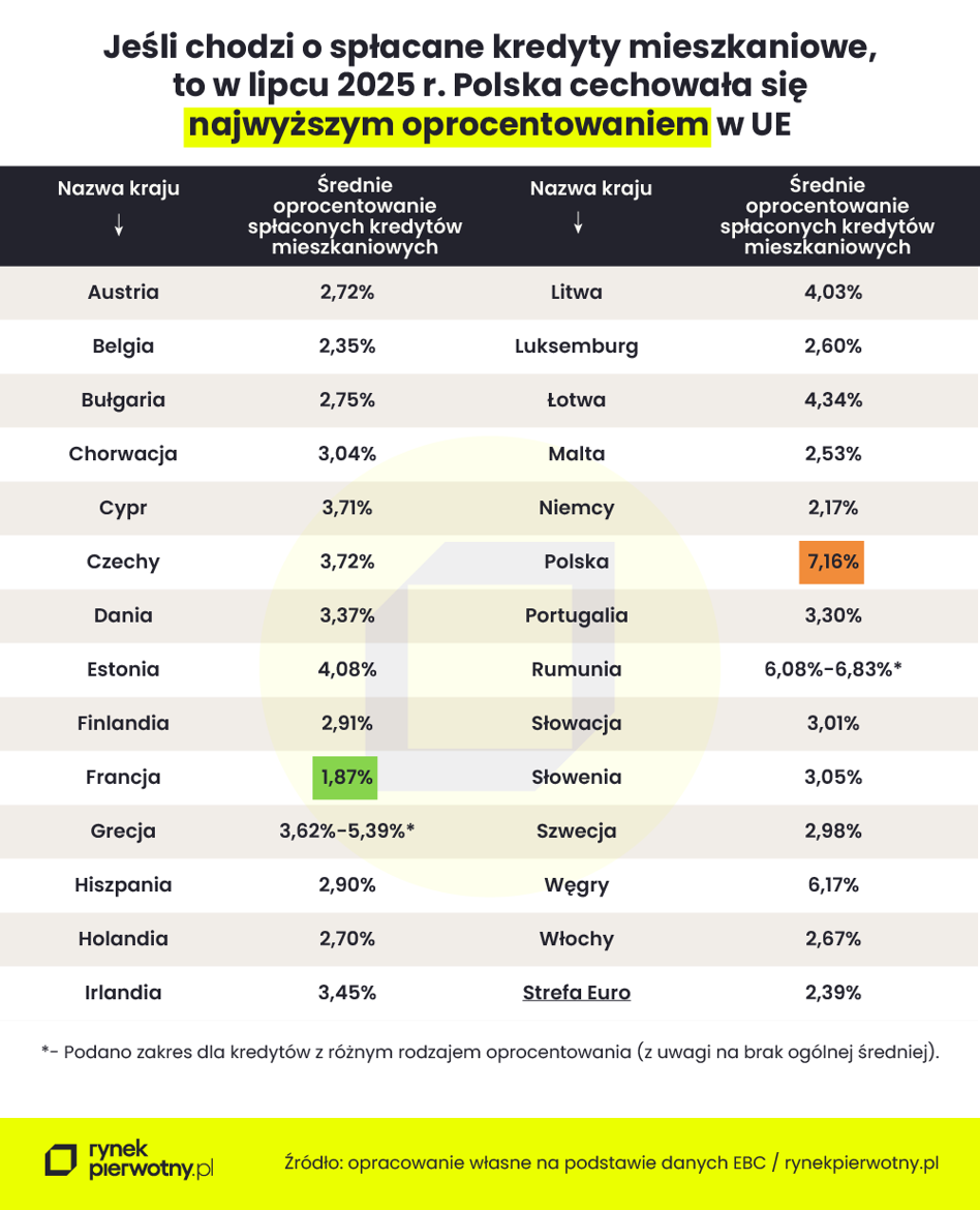W czerwcu br. dokonała się nieco symboliczna kredytowa zmiana, o której krajowe media pisały niewiele. Mianowicie, po raz pierwszy od marca 2024 r. nasz kraj nie cechował się już najwyższym w Unii Europejskiej średnim oprocentowaniem nowych kredytów mieszkaniowych. Jednak nowe „hipoteki” mają znacznie mniejszą łączną wartość (w mld zł) niż starsze kredyty. Eksperci portalu RynekPierwotny.pl postanowili zatem sprawdzić, czy pod względem oprocentowania spłacanych kredytów mieszkaniowych Polska nadal jest niechlubnym liderem w UE.