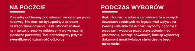 MSW zapewnia, że już sam adresat, który legitymuje się nowym dowodem bez adresu zameldowania, nie będzie miał problemów na poczcie, gdyż do potwierdzenia jego tożsamości nie jest potrzebny adres zameldowania. To numer PESEL służy do tego celu. To fakt, ale czy pracownice w okienkach pocztowych będą miały dostęp do bazy ewidencji ludności, aby zweryfikować ten numer lub adres zamieszkania? Raczej nie.