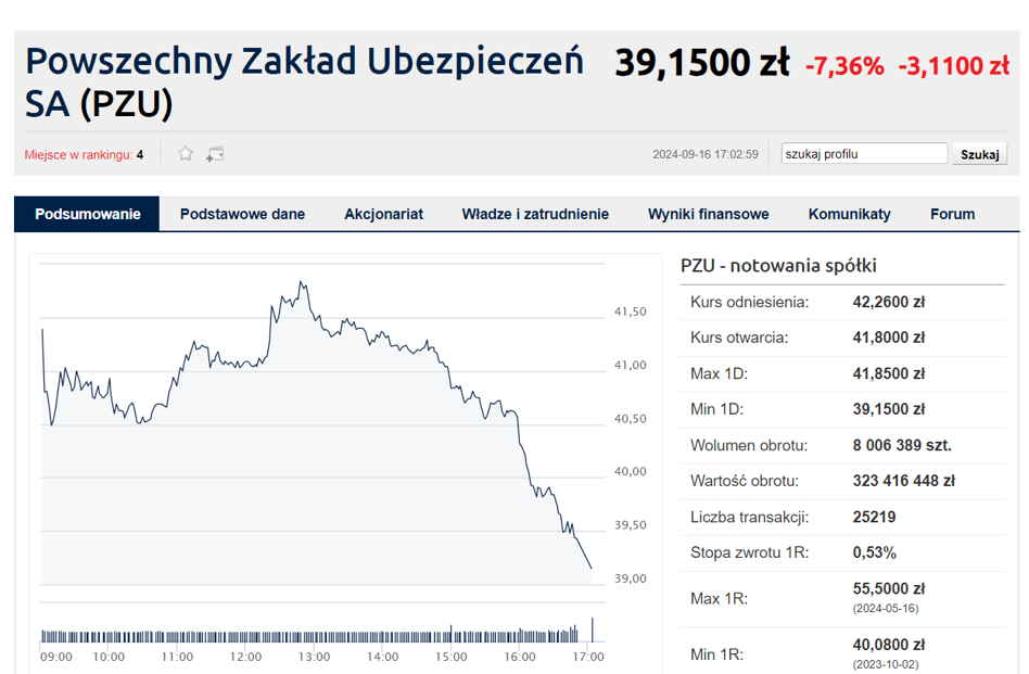 Po starcie sesji o ponad 4,4 proc. spadał kurs akcji PZU, największego krajowego ubezpieczyciela notowanego w WIG20. Po godz. 16.00 wyprzedaż przyspieszyła i sięgała już około 6 proc. Ostatecznie, na koniec sesji kurs spadł o 7,36 proc. do 39,15 zł, i był najniżej od września 2023 r. Obroty w handlu akcjami PZU wyniosły w poniedziałek 322,6 mln zł i były największe tego dnia na GPW. Warto dodać, że poniedziałek był pierwszym dniem dla kursu PZU bez notowania "odciętej" od niego dywidendy w wielkości 4,34 zł na akcję. Bankierowe notowania uwzględniają już to zdarzenie.
